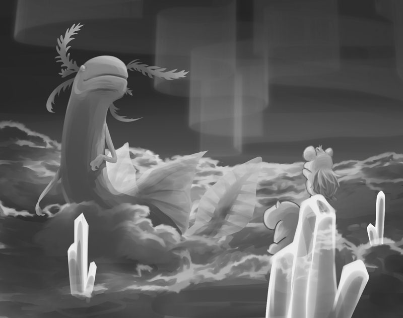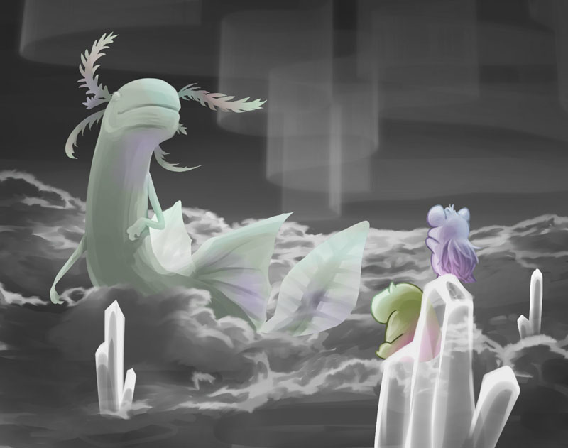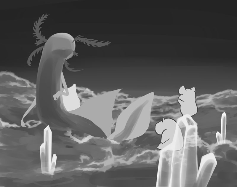 下書きの岩が意図せずクリスタルっぽくなってたのが